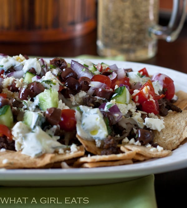 Greek nachos are great as a snack, appetizer, or even a main dish. Crispy pita chips are covered with seasoned lamb, olives, tomatoes, cucumber, onion, Greek spices and two types of cheese.