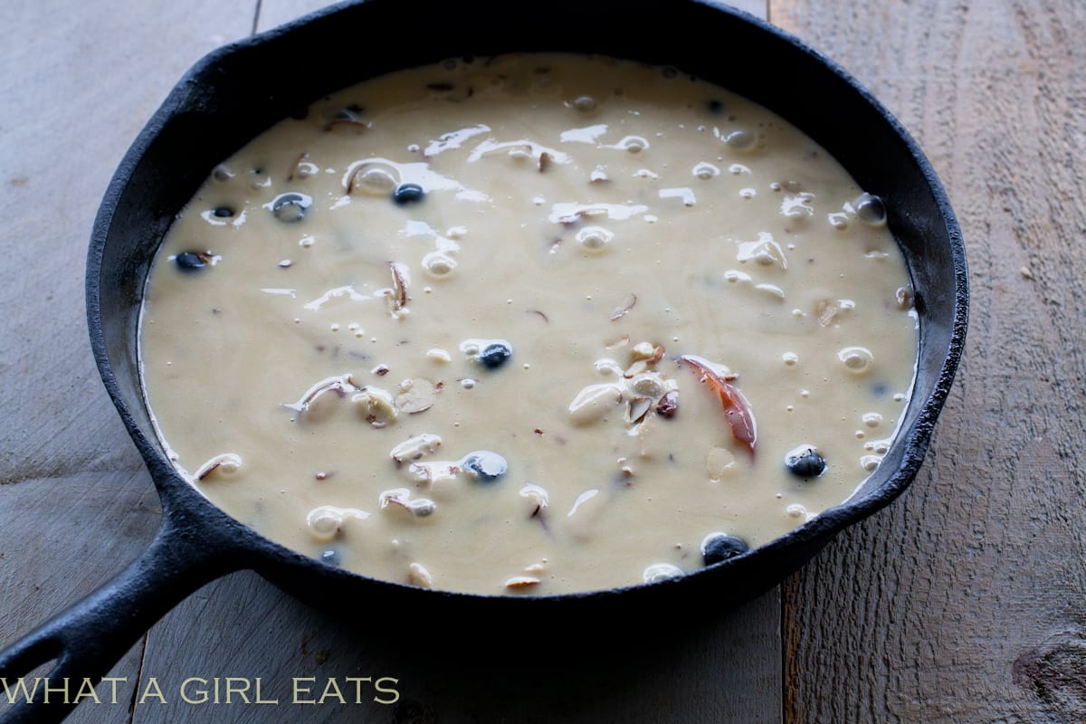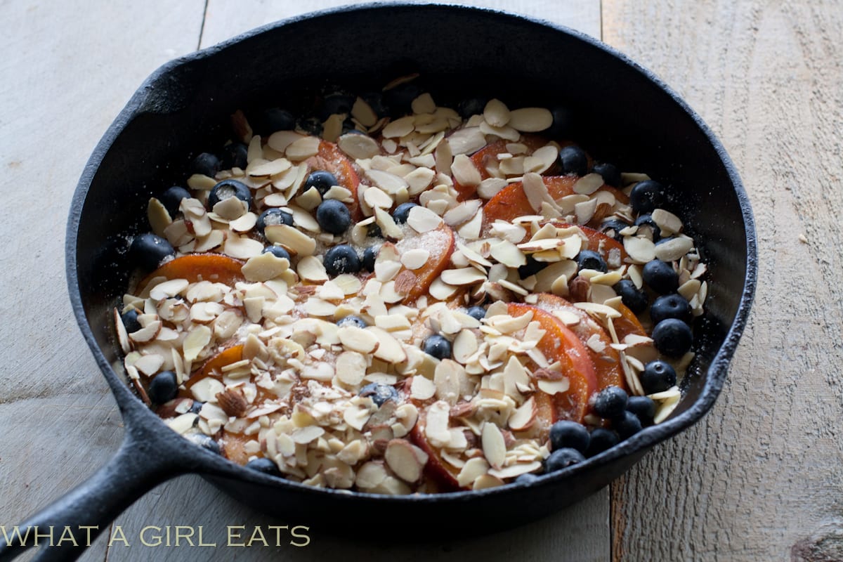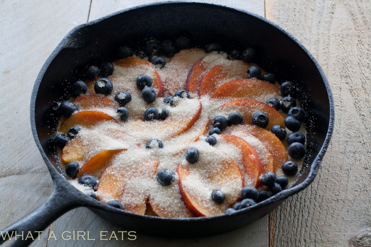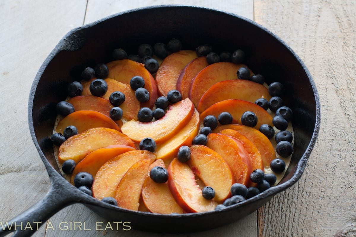 Preheat oven to 350 degrees F. Grease a 10″ cast iron skillet or baking dish. Pour in a thin layer of the batter into the bottom of the skillet or baking dish and bake for about 5 minutes, just to set the batter. Layer the fruit over the batter.